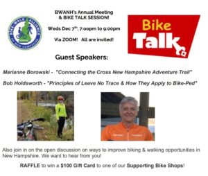 Mark your calendars for the evening of Wednesday December 7th, 7pm. Don’t miss BWANH’s Annual Meeting via Zoom, featuring a Bike Talk Session with guest speakers and a chance to win a $100 Bike Shop Gift Card! Check out the agenda below. The Annual Meeting is open to all members of the general public – BWA members and non-members. You must register for this free event to receive the Zoom link.