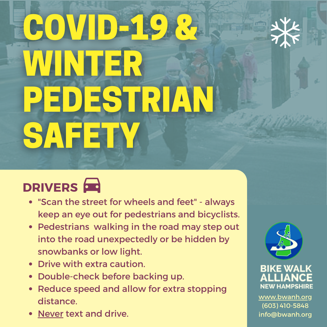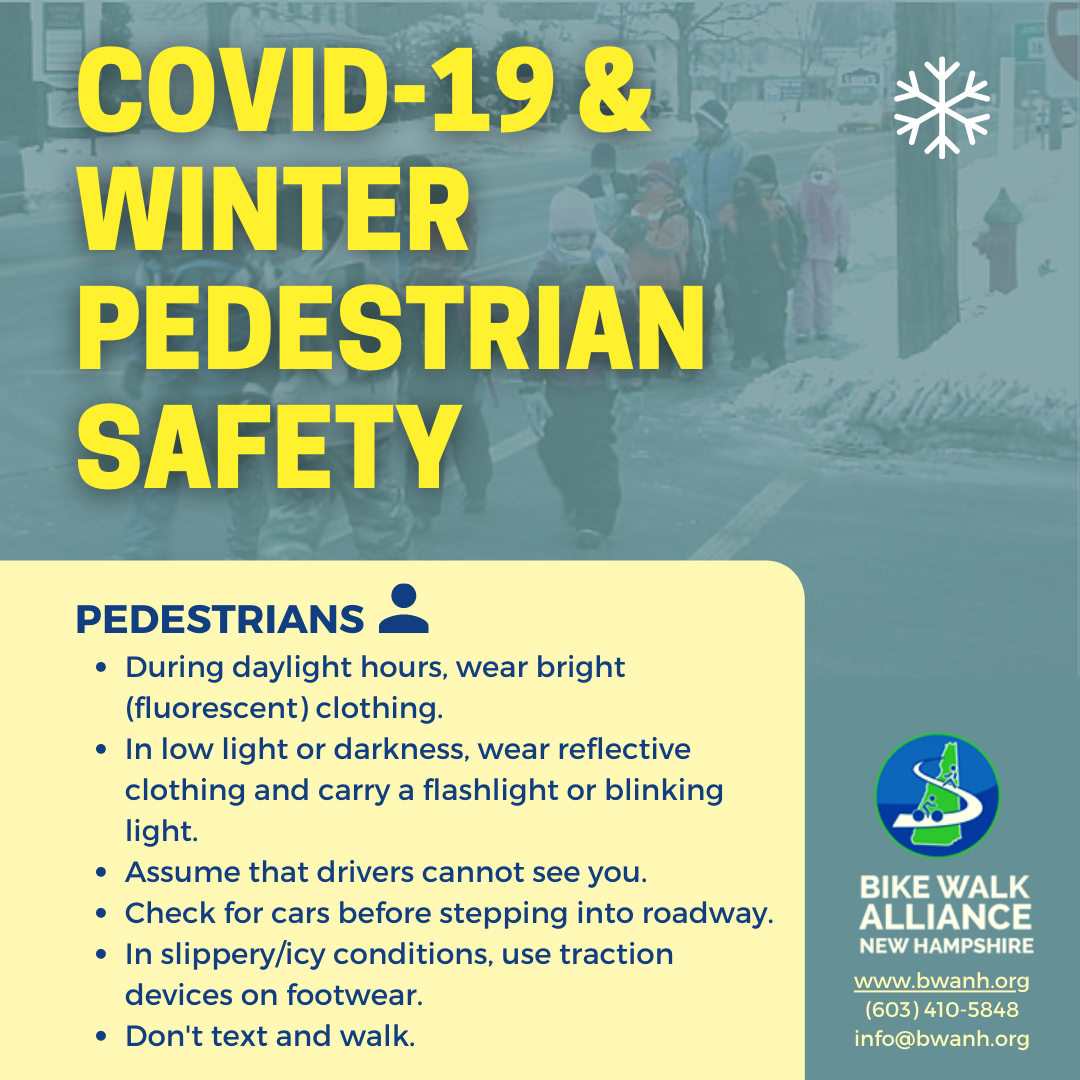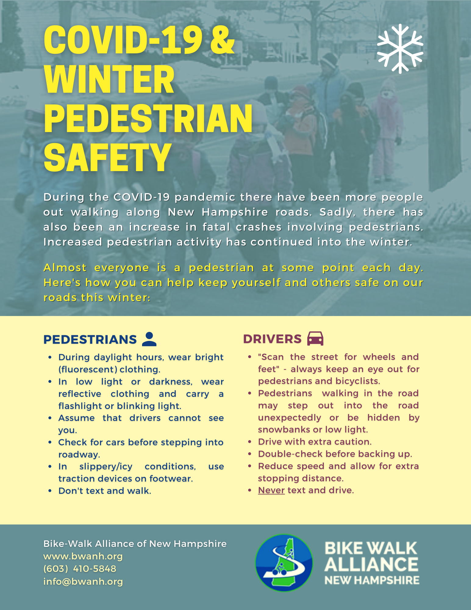 During the COVID-19 pandemic, more people are out walking along New Hampshire roads. Sadly, there has also been an increase in fatal crashes involving pedestrians. The increase in pedestrian activity will likely continue through winter months as people seek opportunities for exercise, and for mental well-being. Also many people use walking as their primary transportation method.